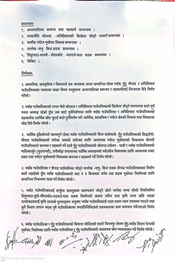 साथै ब्याँस गाउँपालिका र दुहुँ गाउँपालिकाको सीमाना जोडिएको तङ्ले विजयपुर क्षेत्रमा दुहु–ब्याँस मिलन केन्द्रको पूर्वाधार निर्माणका लागि दुबै पालिकाले आवश्यक स्रोत व्यवस्थापन गर्ने निर्णय भएको छ ।