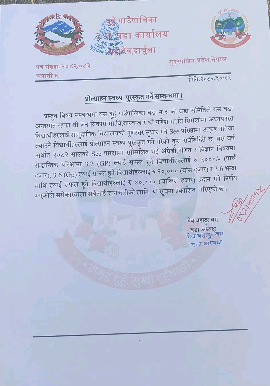 दार्चुला : माध्यमिक शिक्षा परीक्षा एसइईमा उत्कृष्ट नतिजा ल्याउने विद्यार्थीलाई दुहुँ गाउँपालिका वडा नम्बर ३ ले सम्मान गर्ने भएको छ । वडा अध्यक्ष देव बहादुर बमले एसइई परीक्षामा उत्कृष्ट नतिजा ल्याउने वडामा रहेका दुई विद्यालयका विद्यार्थीलाई प्रोत्साहन स्वरुप नगदद्धारा सम्मान गर्ने घोषणा गरेका हुन् ।